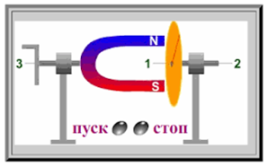 Демонстрація 6. До тепер ми розглядали ситуації, в яких той магнітний потік що пронизує струмопровідний контур, був перпендикулярним до площини відповідного контура. В законі ж електромагнітної індукції стверджується: при будь якій зміні того магнітного потоку, що пронизує струмопровідний контур … Ілюструючи оте «при будь якій зміні магнітного потоку», проводимо наступну демонстрацію. Перед підковоподібним магнітом, що може примусово обертатися навколо осі своєї симетрії, розташовуємо алюмінієвий диск, що вільно обертається навколо його геометричного центру. Фіксуємо, що при обертанні магніту, алюмінієвий диск починає обертатися в тому ж напрямку що й магніт, і що при зміні напрямку обертання магніту, змінюється і напрям обертання диску.