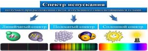 Видиме світло – це потік електромагнітних хвиль, довжини яких знаходяться в межах від 3,8∙10–7м до 7,6∙10–7м. Результатом розкладання світла на його складові частини є кольорова картинка, яка називається спектром випрмін6ювання. Спектри поділяються на суцільні, лінійчаті та смугасті. Крім цього вони поділяються на спектри випромінювання і спектри поглинання.