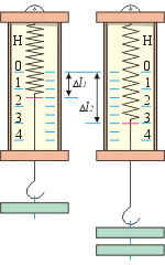 - Навантажуємо пружину тягарцем відомої маси (зазвичай 0,1кг) та вимірюємо відповідне видовження пружини Δℓ1.