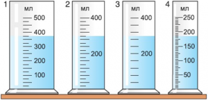 - Формально ΔV3 = 200мл/5 = 40мл. Однак враховуючи факт того, що в мірному циліндрі №3, відстані між поділками є візуально великими, допускається ціну поділки зменшити вдвічі. Тому можна вважати, що ΔV3 = 200мл/10 = 20мл. При цьому, V3 = 300мл, δ3 = (ΔV3/V3)·100% = (20мл/300мл)·100% = 6,7%.