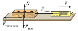 - Так як показано на малюнку, тіло з постійною швидкістю протягуємо досліджуваною горизонтальною поверхнею і фіксуємо показання динамометра, які фактично дорівнюють величині сили тертя. Якщо тіло занадто легке, то його масу, а відповідно і діючу на нього силу тяжіння, збільшуємо тягарцями відомих мас.